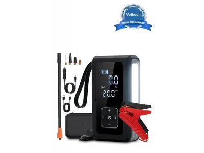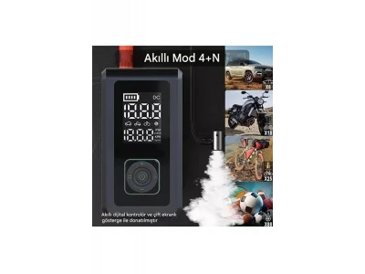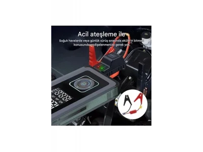 Güçlü Akü Takviye (Jump ter) Özelliği 6.0L'ye kadar araçları çalıştırır 1200A anlık akım ile motoru hızlıca canlandırır Smart Protection System: Ters kutup, aşırı voltaj, kısa devreye karşı akıllı güvenlik Dijital Hava Kompresörü (150PSI) Lastik, ? bot, top, yüzme halkası için 5 farklı şişirme modu LCD ekranlı dijital göstergesi ile hassas basınç takibi Otomatik durma özelliği sayesinde fazla şişirme riski yok LED Işık ve SOS Modu Gece kullanımı için parlak LED fener Acil durumlar için SOS flaş modu Powerbank Fonksiyonu & USB-C Hızlı Şarj 12.000mAh batarya kapasitesi ile telefon, tablet ve cihazlarınızı şarj edin USB-C hızlı giriş-çıkış desteği sayesinde hızlı şarj kolaylığı Teknik Özellikler: Özellik Açıklama Kapasite 12.000mAh Başlatma Akımı 1200A Maks.