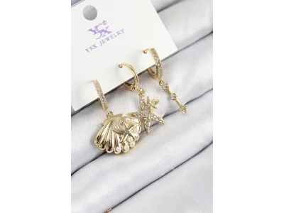 Pirinç Zirkon Taşlı 3'lü İstiridye Ve Yıldız Model Gold Renk Kadın Küpe