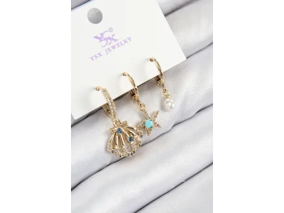 Pirinç Zirkon Taşlı 3'lü Yunus Balığı Ve İstiridye Model Gold Renk Kadın Küpe