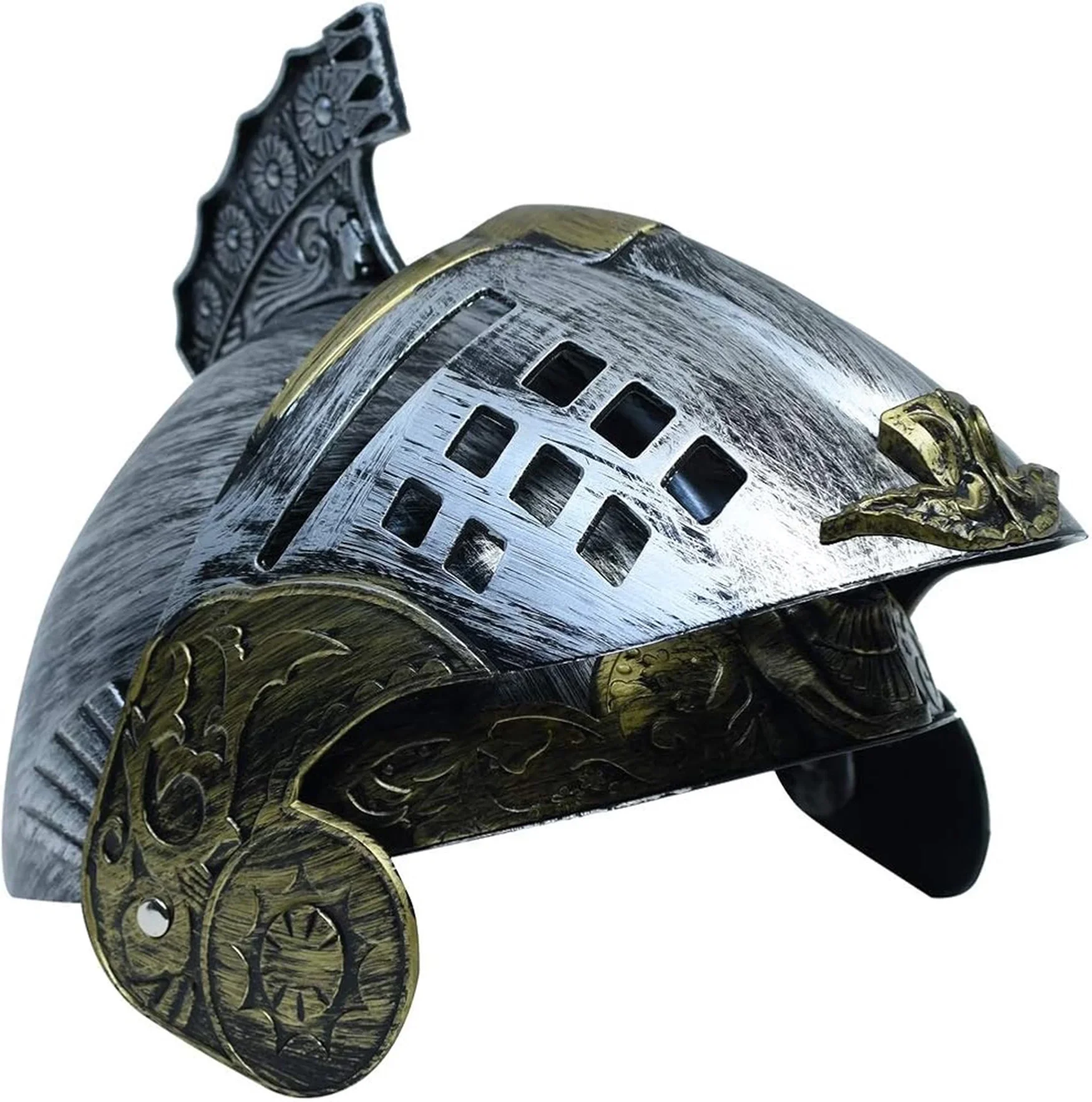 Bu Romalı Bizans kaskı miğferi, Gümüş ve Altın renkleriyle göz alıcı bir görünüme sahiptir. 25x20 cm boyutlarındaki bu miğfer, yetişkinler için standart ölçüdedir ve oynar başlıklıdır.