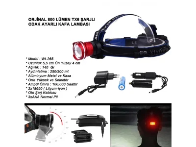 Orjinal 800 Lümen T6 Şarjlı Kafa Feneri Wt-265